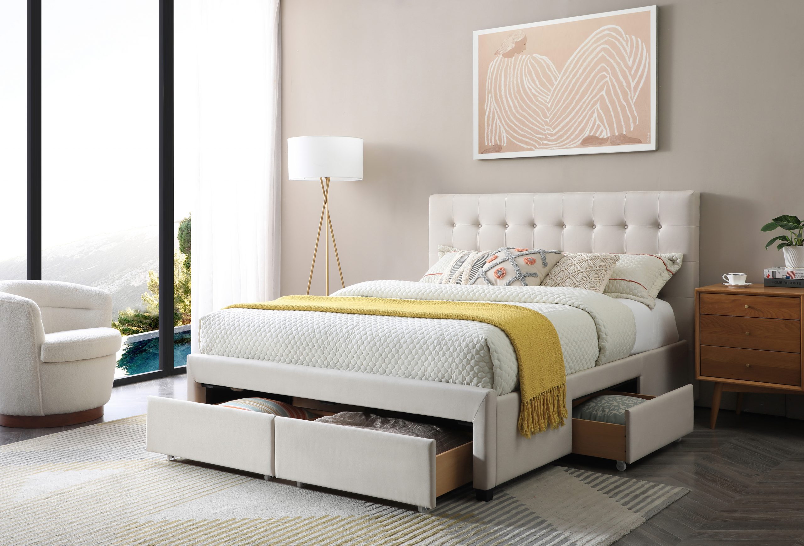 The Palermo Double Size Bedframe with 4 Drawers offers both style and storage. Its sleek design and built-in drawers provide a practical solution for keeping your bedroom organized while offering sturdy support for a restful night’s sleep.