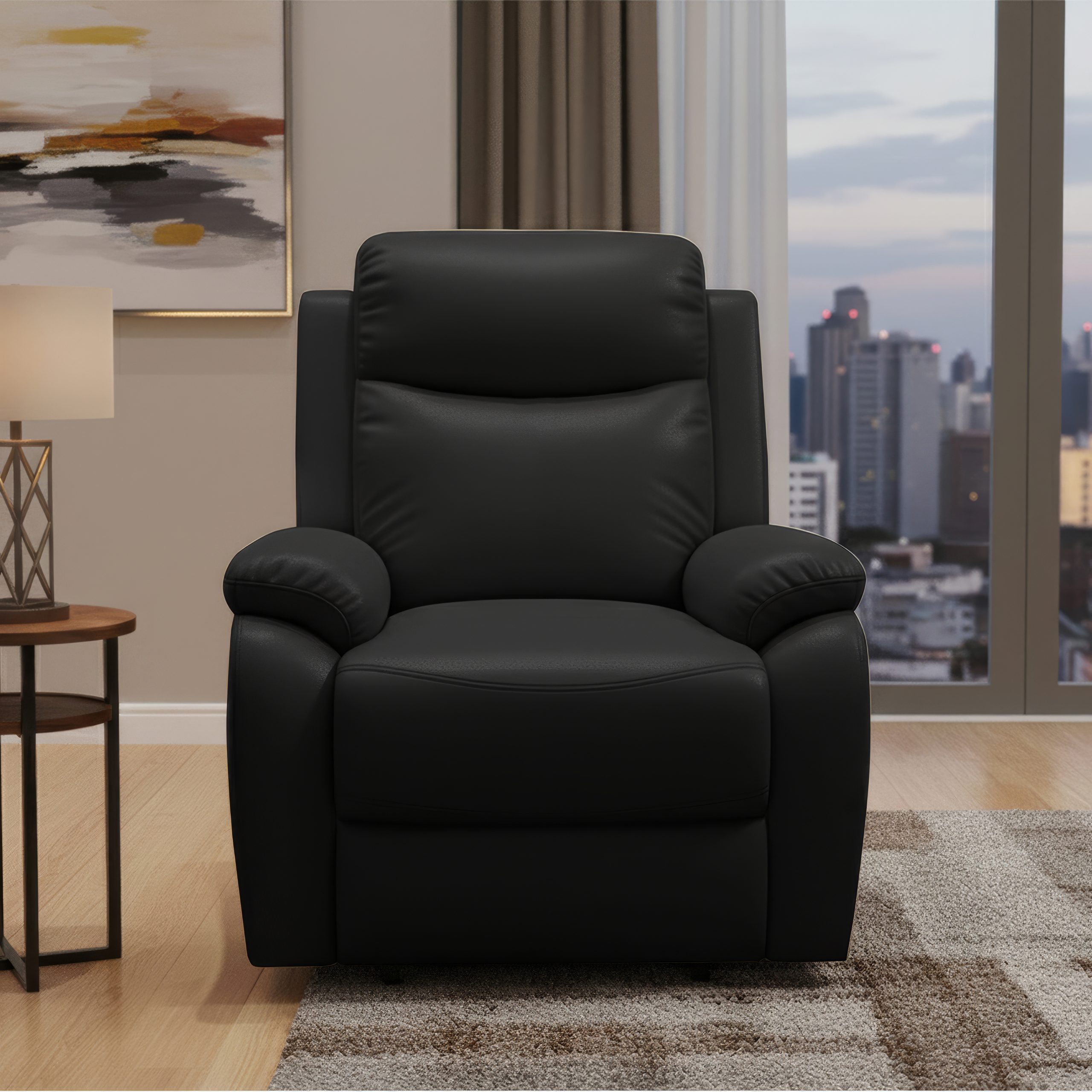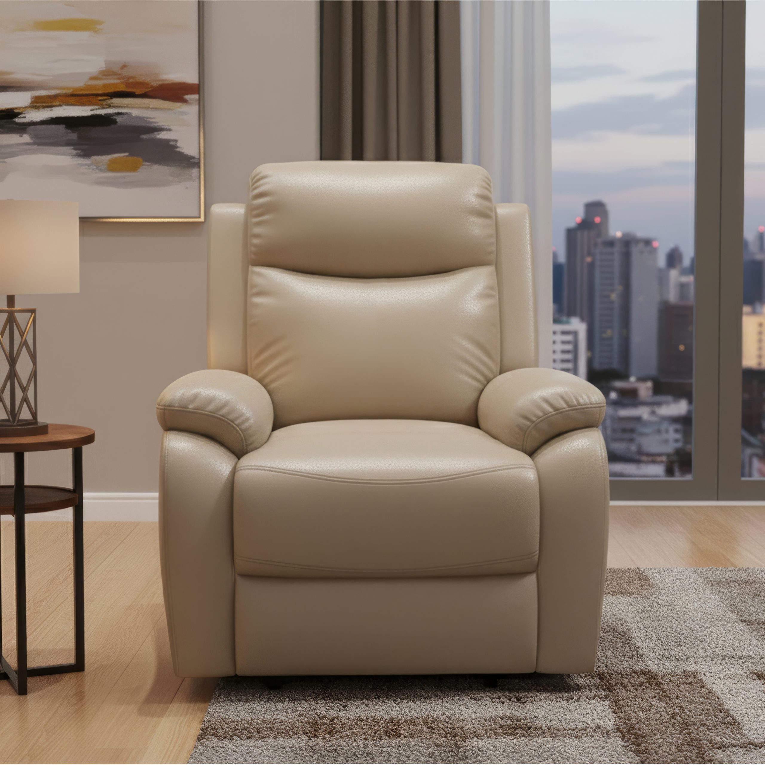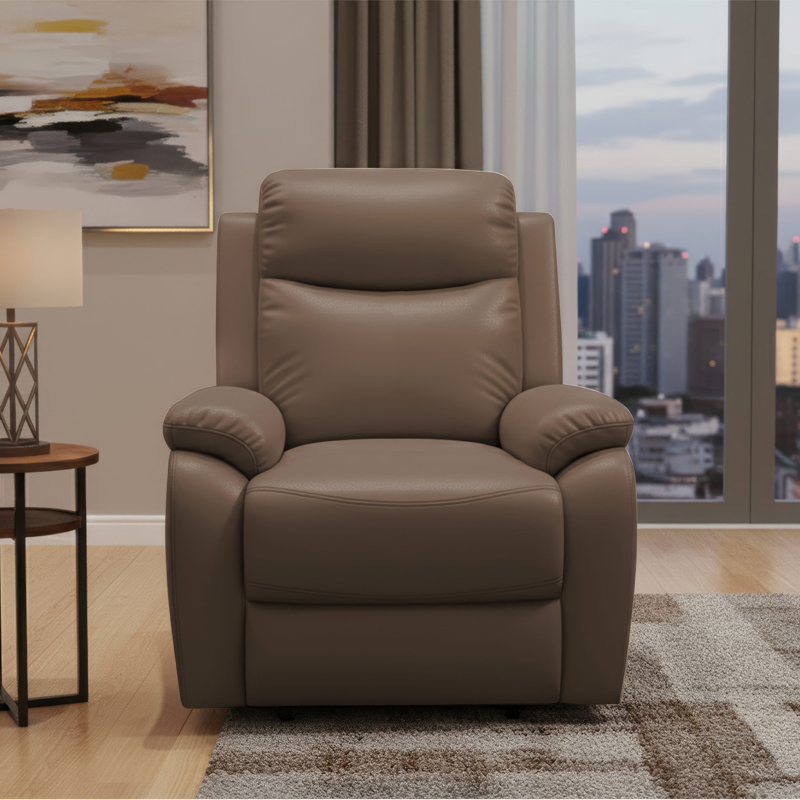 The Torino one-seater leather recliner combines sturdy construction with cozy comfort and a refined finish. It features a pine wood frame reinforced with high-density plywood, ensuring both durability and structural stability. The cushioning blends HDR PU foam with Softy foam to deliver a semi-soft, inviting seat.