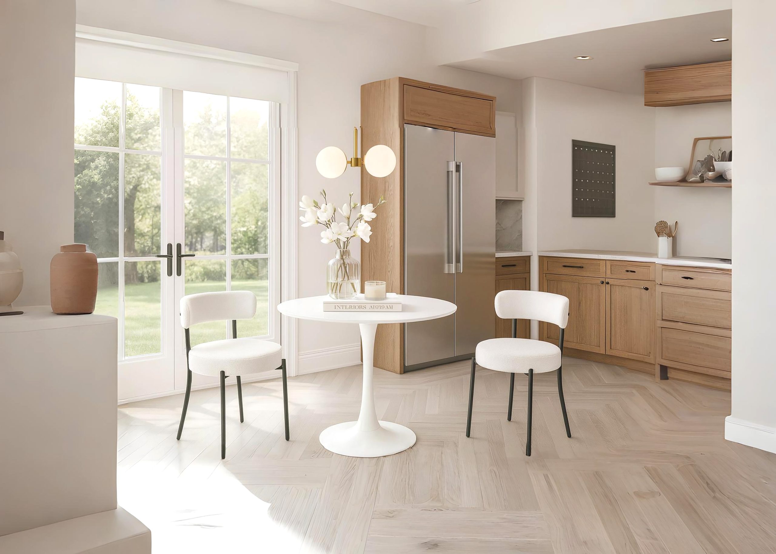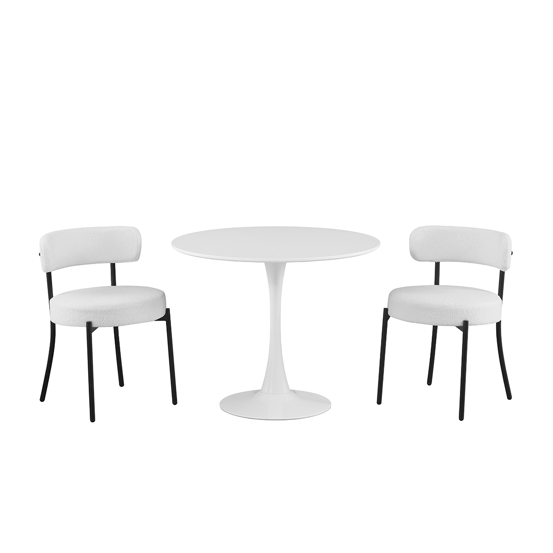 Introducing the VELURA 2-Seater Dining Set, the perfect solution for apartment living, small kitchens, or cozy breakfast nooks. This space-saving set features a clean, white round tulip table with a sleek pedestal base, paired with two contemporary chairs boasting plush, textured white upholstery and modern black legs.